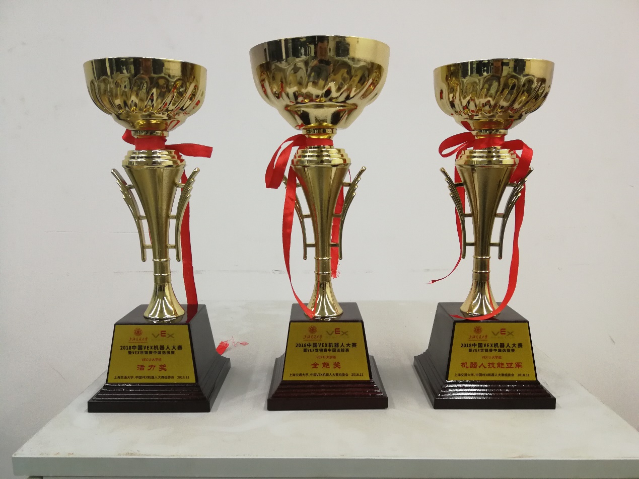 参赛,经过三天的角逐,在VEX机器人技能挑战赛中分别取得了第二名与第四名;在团队协作联赛中,分别以第二名与第六名的成绩进入八强的角逐,虽然最终两支队伍在联赛中都止步八强,但由于良好的团队表现与优质的工程笔记获得了评审的一致好评,同时参考技能赛、联赛的综合表现,最终脱颖而出,两支队伍分别获得了单项奖中的活力奖,与赛事最高奖项全能总冠军,并因此获得了参加明年四月份美国VEX世界锦标赛的参赛资格。