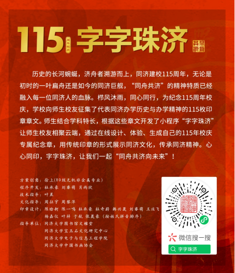 叶晨老师带领学生团队开发的“字字珠济”小程序正式上线,献礼同济115岁生日。这份礼物饱含着校友的创意、专业的指导、师生技术的创新和文化的融合,凝聚着师生校友共同的祝福。