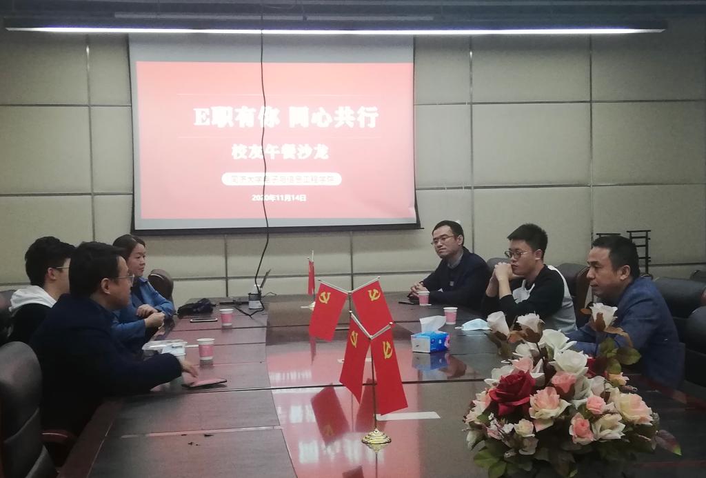 2020年11月14日中午,学院“E职有你·同心共行”校友沙龙活动在智信馆305会议室成功举行。沙龙由学院党委副书记张南华老师主持,研究生辅导员潘玥老师、本科生辅导员常恒老师以及优秀校友们参加了此次活动。