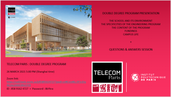 于与巴黎高科-国立巴黎高等电信学校签署了双文凭合作协议。为了进一步帮助我校相关学生了解国立巴黎高等电信学校的双文凭项目,该校国际项目负责人Nicolas PROST先生将于2021年3月26日举行线上宣讲会,欢迎同学们踊跃参加。