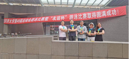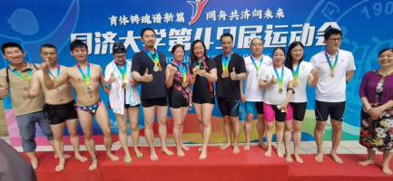由孙世琳、贺青、邹红艳、王汉卿4位老师组成的团队在男女混合4×50米自由泳接力赛中以0.01秒的领先优势,勇夺冠军。