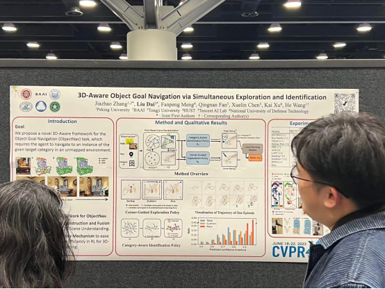 计算机科学与技术专业的2020级本科生戴浏参会并在会上作了题为“3D-Aware Object Goal Navigation via Simultaneous Exploration and Identification”的海报交流,该工作由戴浏作为共同第一作者与来自北京大学、华中科技大学、腾讯人工智能实验室等机构的研究者合作完成。该篇工作提出了业内第一个具备三维感知能力的物体目标导航算法,由两个精心设计的“角落目标探索策略”和“类别相关确认策略”共同驱动,实现了当前室内物体目标导航领域内的最高性能,受到了与会专家学者的关注。