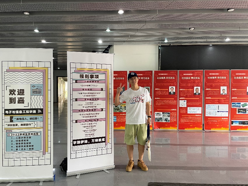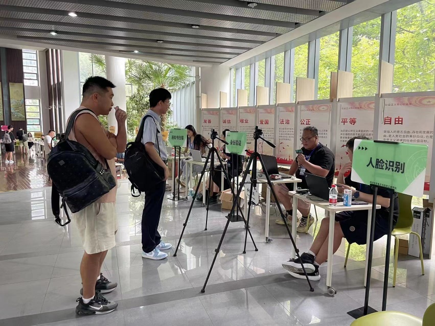 迎新现场,新生按志愿者学长学姐的引导,依托信息化技术,有序开展人脸识别、扫描通知书、各系进行学历学位证查验、领取学生证、办理户口迁移和党组织关系转移手续,完成各环节报到。