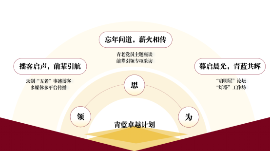“领”——播客启声,前辈引航:重温“五老”故事,薪火相传赓续红色血脉,录制“五老”播客节目,融合多媒体元素,依托多平台传播,打造沉浸式学习体验,将“五老”的光辉事迹以现代化的方式进行宣扬与传承,激励更多青年师生肩负时代责任。