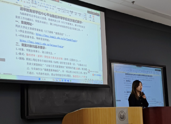 2025年2月28日下午,学院毕业研究生学位申请宣讲会在嘉定校区复楼102会议厅举行。会议系统解读本年度学位授予政策变化,重点剖析查重盲审新规、答辩材料提交规范等关键环节,为毕业生提供全流程操作指南。本次宣讲会采用线上与线下相结合的形式召开,学院全体研究生教务员、2025届硕博士研究生550余人参会,会议由曹雅雯老师和肖可馨老师主持。