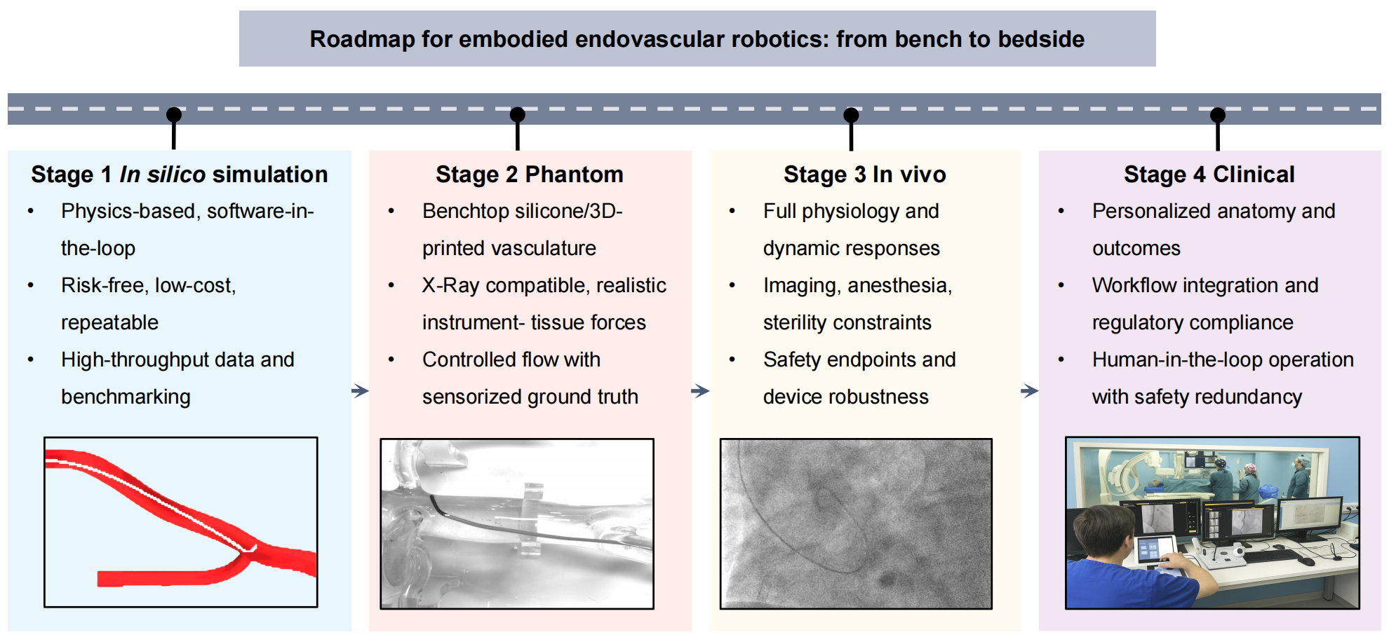 论文从系统角度归纳了血管介入机器人迈向具身智能的关键能力模块,包括术中场景理解的智能感知、器械操控的学习型控制范式以及临床落地的转化路径。研究指出,未来发展重点不在于“完全替代医生”,而在于构建以专家监督为核心的人机协同范式:医生从“依赖手工技巧的操作者”逐步转变为“策略制定与关键节点把控的监督者”,机器人则在精细操控、稳定执行与风险预警方面发挥优势,在安全边界内实现增强智能。