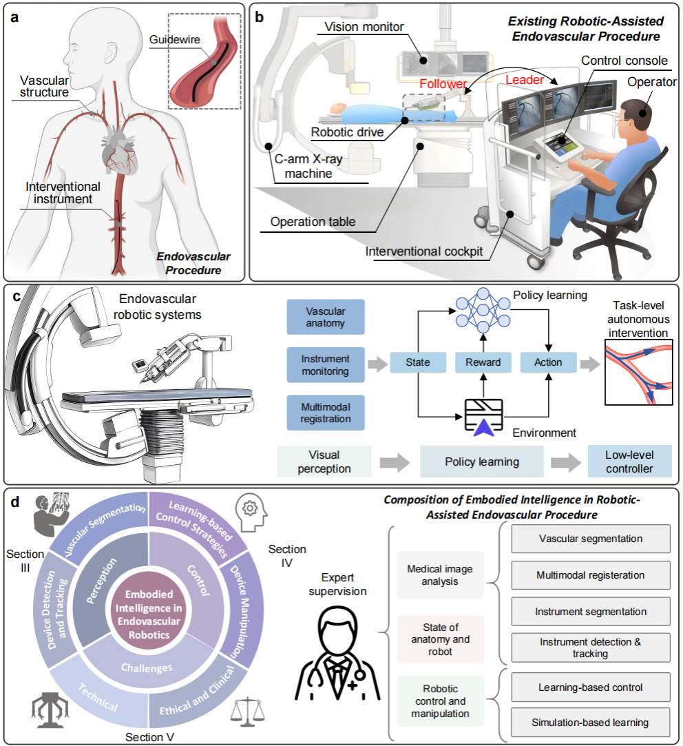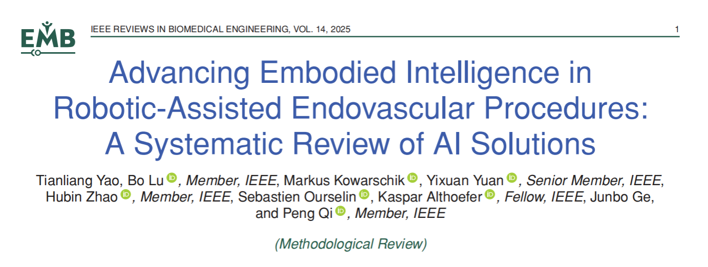 控制科学与工程系齐鹏副教授团队在IEEE生物医学工程领域权威综述期刊《IEEE Reviews in Biomedical Engineering》(中科院一区TOP期刊,IF=12)发表题为“Advancing Embodied Intelligence in Robotic-Assisted Endovascular Procedures: A Systematic Review of AI Solutions”的系统性综述论文。该成果面向血管介入手术机器人这一高端医疗装备关键方向,围绕具身智能的“感知-决策-控制”范式,系统梳理人工智能驱动的研究进展,提出面向临床可转化的技术路线与发展框架,为介入手术机器人由“主从遥操作”向“人机协同的增强智能”演进提供系统化参考。