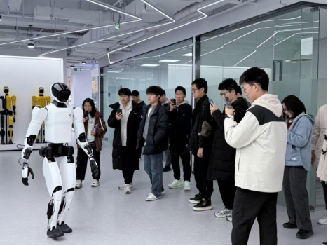 上海开普勒机器人有限公司作为机器人技术领域的领军企业,致力于智能机器人的研发、生产与销售,产品广泛应用于工业制造、物流运输、服务导览等多个领域。在参访过程中,同学们近距离见证了零散部件整合为完整机器人的全过程,直观感受了精密制造的科技魅力,对机器人研发生产的工艺逻辑形成了更为深刻的理解。在公司的演示区,同学们观看了机器人行走、快递处理等实际应用场景演示。一台机器人灵活穿梭于模拟作业环境中,精准高效地完成了各项任务,展现了高度的智能化与自主性。尤其在处理快递环节,机器人依托先进的视觉识别与路径规划技术,快速精准地完成了包裹的分拣与搬运,令在场师生赞叹不已。