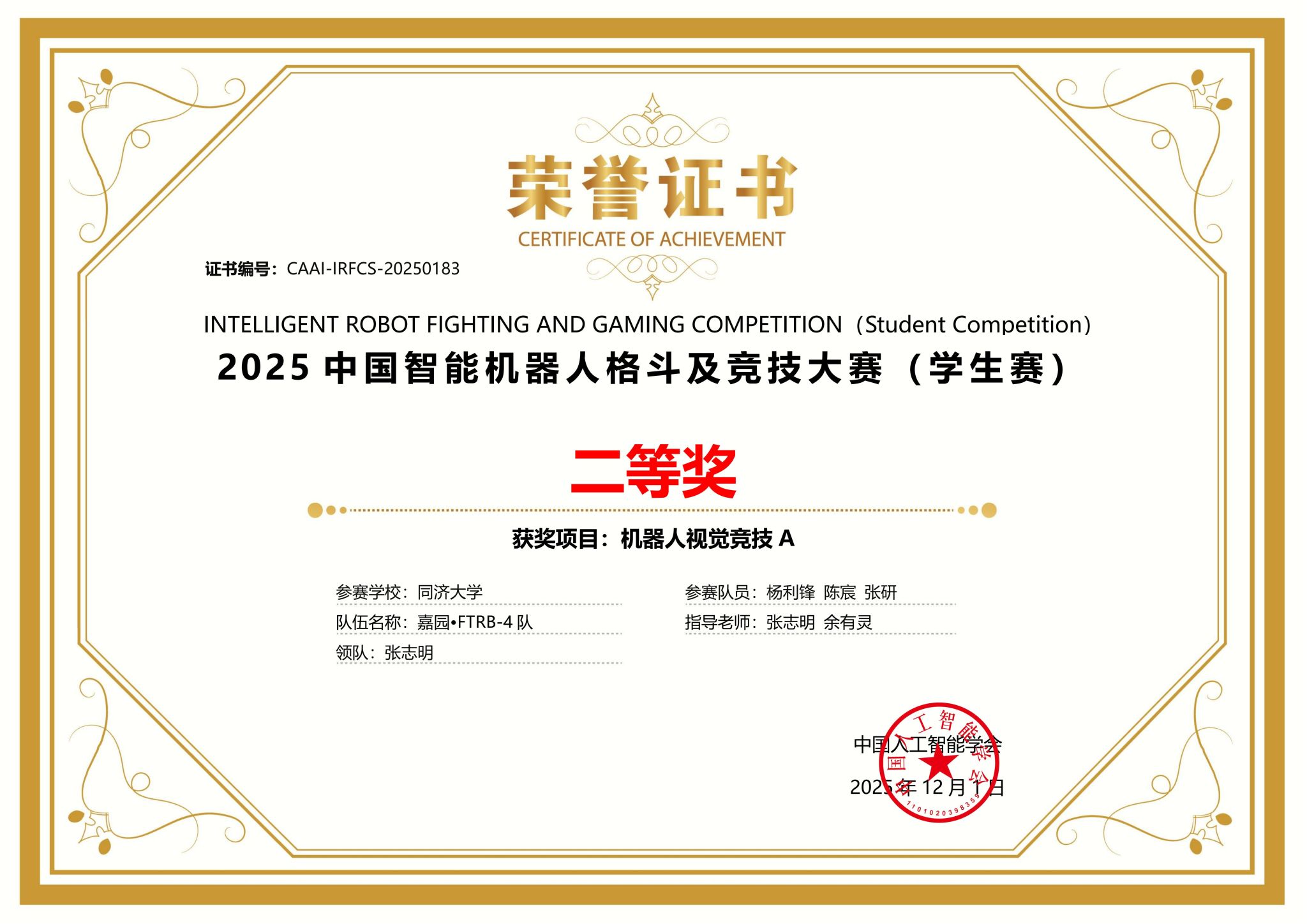 )、杨晓圆(工程实践中心)和顾剑峰(中德工程学院)4位教师的联合指导下,以及老队员郭济恺、郭韫诚2位同学的协助下,6支队伍全部晋级决赛并获国家级奖项。其中“致臻•FTRB-1队”“致臻•FTRB-2队”“致臻•FTRB-3队”均获仿人体感格斗组一等奖,“嘉园•FTRB-6队”获服务机器人竞技B组一等奖,嘉园•FTRB-5队”和“嘉园•FTRB-4队”分获机器人视觉对抗A组一等奖和二等奖。