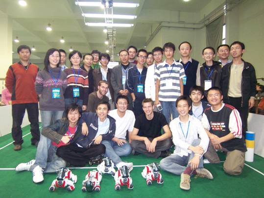 参加本次比赛的“同济方舟队”共由6名研究生,6名本科生组成(另有两名德国访问学生友情参加了比赛)。为了备战本次参赛,参赛队员在陈启军教授的指导和学校教务处等部门的支持下,对RoboCup机器人足球进行了持续性研究,始终使我校的四足机器人在国内外保持了优势地位。本次比赛中,队员们不畏强手,先以3∶3踢平中国科学技术大学代表队,又分别以7∶1和5∶1力压厦门大学和北京工业代表队。最后,由于净胜球处于劣势,所以屈居第二。