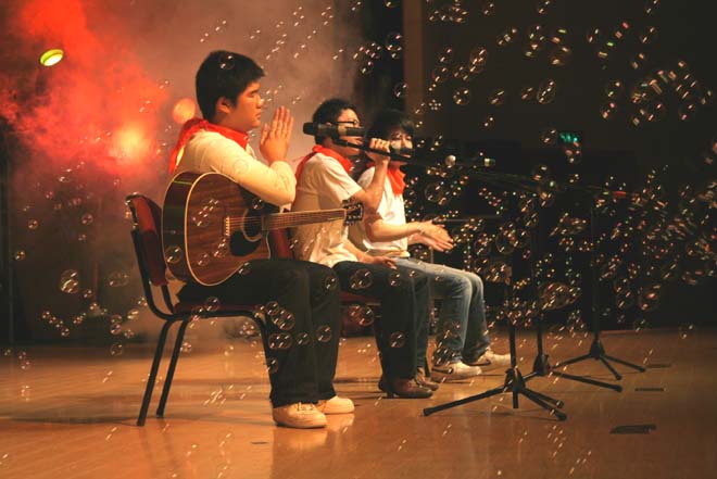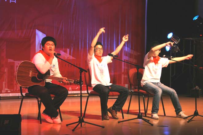 徐而峰、沈叶忱同学演唱的串烧歌《同桌的你》、《红蜻蜓》、《朋友》让大家充分感受到了校园生活的乐趣;刘 磊、曹克正、刘志成、沈叶忱演唱的一首《奔跑》让大家感受到青春的活力。他们演唱时,麻豆在线