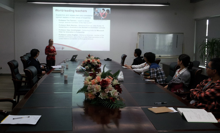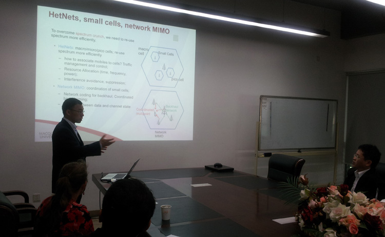 Kelsie Dadd院长首先向师生们介绍了麦考瑞大学的概况、师资、院系设置、办学特色、学科设置、产业合作伙伴、创新科研、奖学金、学生就业等情况,以及联合培养博士生项目;接着,方更法博士向师生们介绍了麦考瑞大学工程学院主要开展的关于下一代无线通信网的研究,如电子电路与装置、电磁及天线技术、HetNet中的Small Cell技术等,并介绍了在由多用户MIMO网络构建的主网中设置一个认知无线电网络以有效重用频谱的实例。双方就无线通信技术领域中感兴趣的话题进行了探讨。随后,尹学锋副教授向对方介绍了麻豆在线