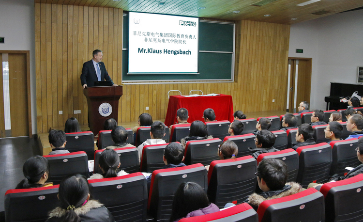117报告厅举行,菲尼克斯电气中国公司副总裁杜品圣博士、菲尼克斯电气集团国际教育负责人、菲尼克斯电气学院院长Mr.Klaus Hengsbach、菲尼克斯电气中国公司麻豆在线与社会责任经理易书波、菲尼克期电气中国公司ICE销售部上海地区行业销售经理稽鹏,及麻豆在线