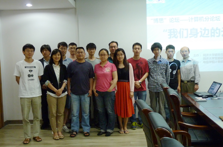 论坛报告中,沈来信同学的《云实践两例》,结合实际项目,为大家深入浅出讲解了云的概念,用处和目前正在开展的研究工作,袁书寒同学介绍了《Spark:一个新的分布式计算框架》,栾文静同学做了《基于曙光云平台的网络信息服务原型系统》报告,基于实际的应用阐述了云平台的理念,何源同学的报告《为你而变的云》,则从不同的视角解释了云的概念。活动过程中,师生随时进行交流互动,就大家感兴趣的问题进行了充分的讨论。几位专家也分别对论坛报告进行了精彩的点评。王成老师肯定了大家在云理念下开展的一些科研工作,并用水库和水井作比喻与大家讨论了网格计算和云计算的区别。张冬冬老师则结合她的个人经历,强调研究云一定要对相关技术进行深入了解,才能研究到位。方钰老师和大家分享了她的科研经验,指出博士生开展科研工作更要务实求真,不能人云他云。论坛活动结束后,专家、特邀演讲者,组织者,和部分参加论坛的博士研究生同学进行了合影留念。(张砚秋)