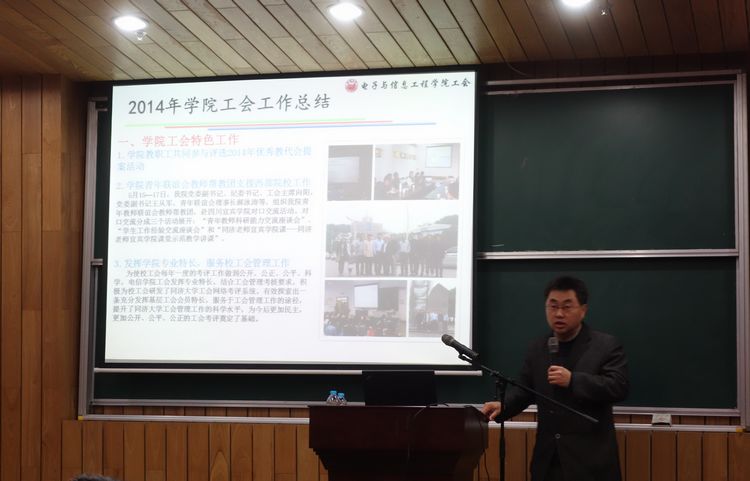 学院党委副书记、工会主席向阳作了学院工会2014年工作总结,从工会的工作特色,规范学院工作、宣传工作、文体工作、生活保障工作、民主管理工作、小家建设工作、2014年学院获得的表彰、2015年工会工作十大任务等方面逐一作了介绍。