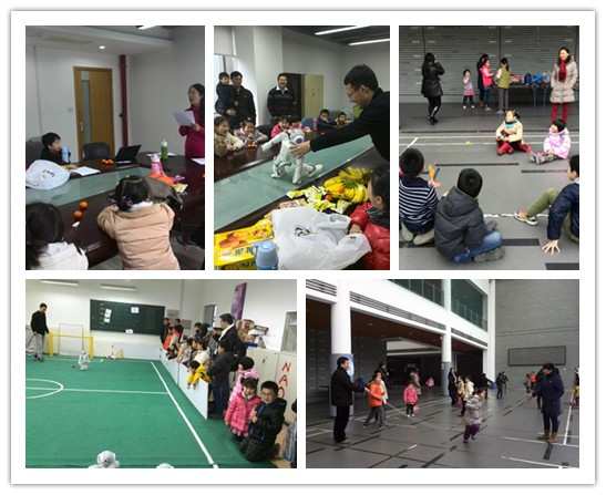 在上午的活动中,余有灵老师以风趣幽默的语言为孩子们讲解和演示乐高机器人,大家听得津津有味;陆凤兰老师教孩子们学说上海童谣,和大家开心地做游戏;研究生们为孩子们展示robocup机器人的精彩动作。