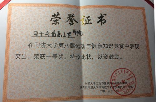 第八届运动与健康知识竞赛决赛在四平路校区经纬楼举行。由学院团委选送的本科生代表队“电火花队”经过激烈比拼,从30多个代表队中脱颖而出,挺进决赛,并最终斩获团队第一名。