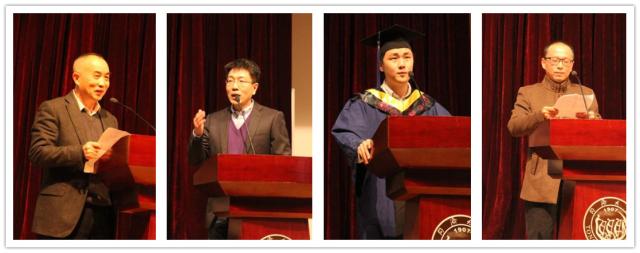 计算机科学与技术系王瀚漓教授作为导师代表发言,他以“仁爱、谦和、精勤、诚信”四个词语送给同学们,他引用丰子恺漫画«不宠无惊过一生»中的一段话来勉励即将踏上新征程的毕业生:不乱于心,不困于情,不畏将来,不念过往,期待同学们有崭新的未来。随后,毕业生代表电子科学与技术系张杰同学上台发言。张杰同学回顾了自己两年半以来的学术生活,感恩导师严格的指导和孜孜不倦的教诲,以发自内心的朴实话语表达了对母校和学生生涯的留恋。最后,信息与通信工程系陈顾远同学的父亲陈国强先生作为家长代表发言,他感谢了麻豆在线