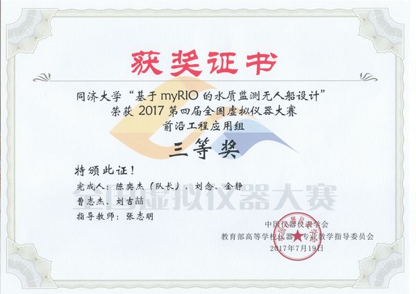 参赛队伍“新风队”在前沿工程应用组决赛中喜获佳绩,参赛作品《基于myRIO的水质监测无人船的设计》获全国总决赛三等奖。