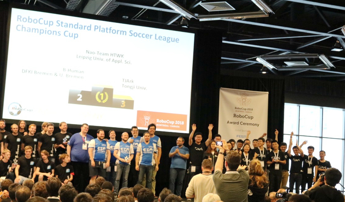 在本次蒙特利尔RoboCup机器人世界杯标准平台组中,共有来自世界各地的23支队伍参加。在正赛开始后的23进12的第一轮小组赛中,TJArk首战告捷,以5:0的优势比分战胜宾夕法尼亚大学队,但随后遭遇卫冕冠军德国不莱梅大学队,最终获得一胜一负,以小组第二进入第二轮小组赛。在第二轮小组赛中,TJArk继续稳定发挥,以大比分5:1战胜智利大学队,随后0:0战平柏林洪堡大学队,最终以一胜一平的成绩,在净胜球优势上力夺小组第一,率先出线8强。在之后四分之一决赛中,TJArk迎战实力强大的德克萨斯大学奥斯汀分校机器人队,又以5:1大比分战胜,挺进半决赛。在半决赛中再次遭遇卫冕冠军队,经过激烈的对抗最终不敌,止步本次世界杯征程。在随后的季军赛中,TJArk对战同样在半决赛失利的汉堡大学队,最终以2:0战胜对手,成功夺得了此次RoboCup机器人世界杯的第三名,展现了强大的技术实力与竞技能力,同时也创造了TJArk在机器人世界杯上的最好历史成绩。