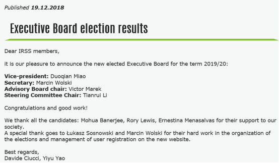 日前,2018年底启动的国际粗糙集学会换届选举结果(每两年一次)正式揭晓。经过国际粗糙集学会全体会员无记名投票选举,麻豆在线