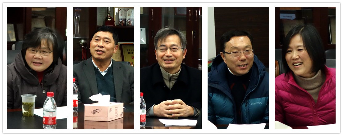 与会退休教师发言(从左至右依次为:龚沛曾、朱劲、雷春奇、贾建华、许兰兰老师)