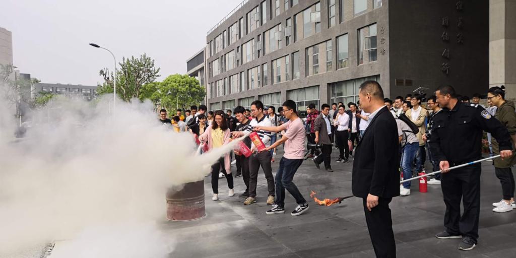 讲座结束后,学院保安人员与韩飞老师合作演示,为师生们清楚地讲解了灭火器的使用、如何在保证自身安全的情况下扑灭火灾,同学们纷纷效仿练习,救火演习顺利展开。