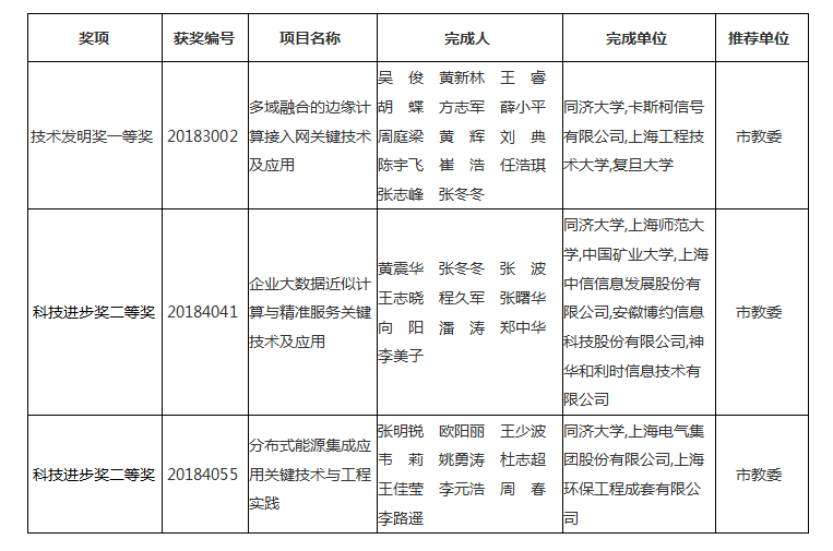 窗体顶端2019年5月15日,2018年度上海市科学技术奖励大会召开。其中,麻豆在线 吴俊教授领衔的“多域融合的边缘计算接入网关键技术及应用”获得技术发明一等奖,张明锐教授领衔的“分布式能源集成应用关键技术与工程实践”、黄震华研究员领衔的“企业大数据近似计算与精准服务关键技术及应用”获得科技进步二等奖。