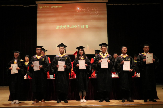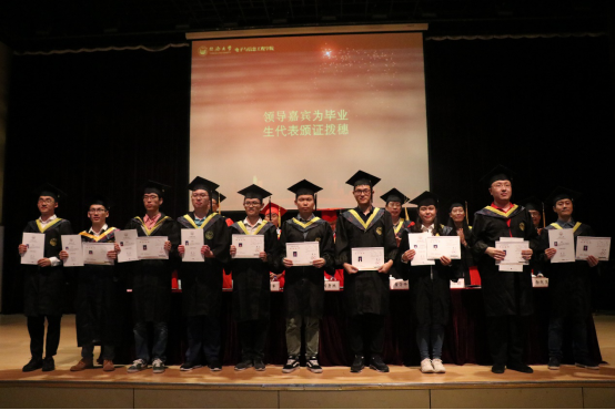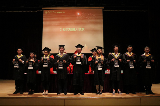 优秀毕业生”称号的优秀电信人,校友联络人也上台接受嘉宾授旗,今后各班级的同学将通过联络人使每位毕业生仍然保持彼此之间以及和母校的联系。