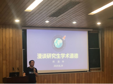 随后,何良华教授为大家做了题为“漫谈研究生学术道德”的报告。何教授以《资治通鉴》中的句子和企业家牛根生的话开头,强调了“德”与“才”的关系以及“德”的重要性;然后详细讲解了学术规范包含的具体要求;最后何教授通过一些实际经典案例告诫大家,一定要避免抄袭、剽窃、伪造等学术不端,堂堂正正做人。
