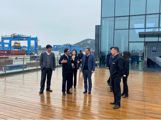 一行人员在青岛港负责人陪同下,分别参观了传统集装箱码头和自动化码头,实地考察了码头运行控制情况,了解了传统码头自动化改造所面临的问题以及自动化码头智能化升级所存在的技术瓶颈,明确了后续校企双方开展产学研合作的技术领域。