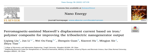 李俊老师团队在国际纳米电子/能源领域顶级期刊《Nano Energy》(中科院一区TOP期刊,影响因子17.881)上在线发表了题为“Ferromagnetic-Assisted Maxwell’s Displacement Current Based on Iron / Polymer Composite for Improving the Triboelectric Nanogenerator Output”的研究论文。