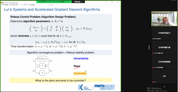 报告结束后,Christian Ebenbauer教授就优化算法综合相关的问题与老师和同学们进行了交流。Christian Ebenbauer教授也根据自身经历勉励同学们要积极拓宽视野,努力探索、发现并解决新的科学问题。此次报告进一步拓展了我校师生的视野,增强了对控制理论综合优化算法的认识与理解。(文/图 张皓 王云姣)