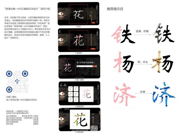 叶晨老师带领的“字字珠济”团队,继去年校庆期间推出“同济印迹”印章设计小程序之后,研发了“辞海古卷——AI赋能汉字创意设计”参展。