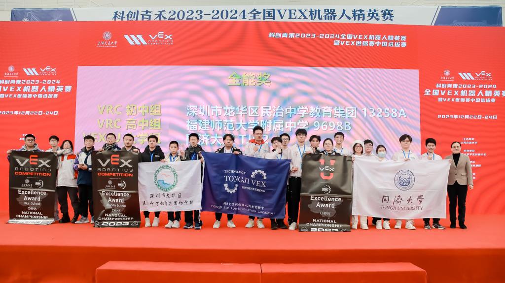2023年12月22日至24日,2023-2024全国VEX机器人精英赛暨VEX世锦赛中国选拔赛在上海交通大学霍英东体育馆举办。本次大赛为期三天,吸引了来自全国的近500支队伍近2000人参赛,覆盖20个省份及直辖市,参赛人数创历史新高。我校派出TJU和TJU2两支队伍参赛。大赛通过挑战赛、技能赛、工程笔记和现场评审对各参赛队伍进行评价。TJU2获得全能奖(最高奖项)和技能赛冠军;TJU和TJU2分获联赛(挑战赛)3、4名的好成绩。
