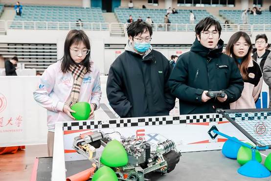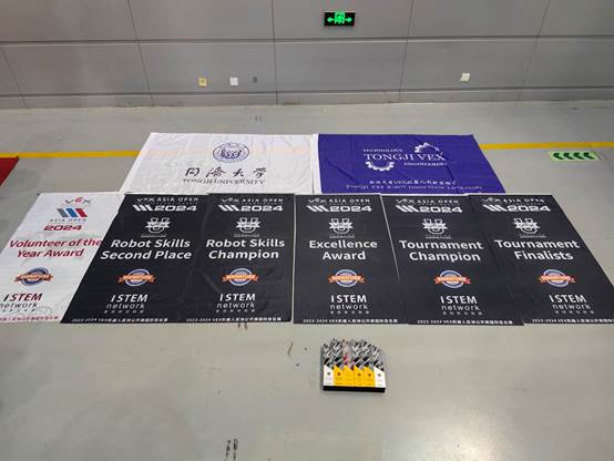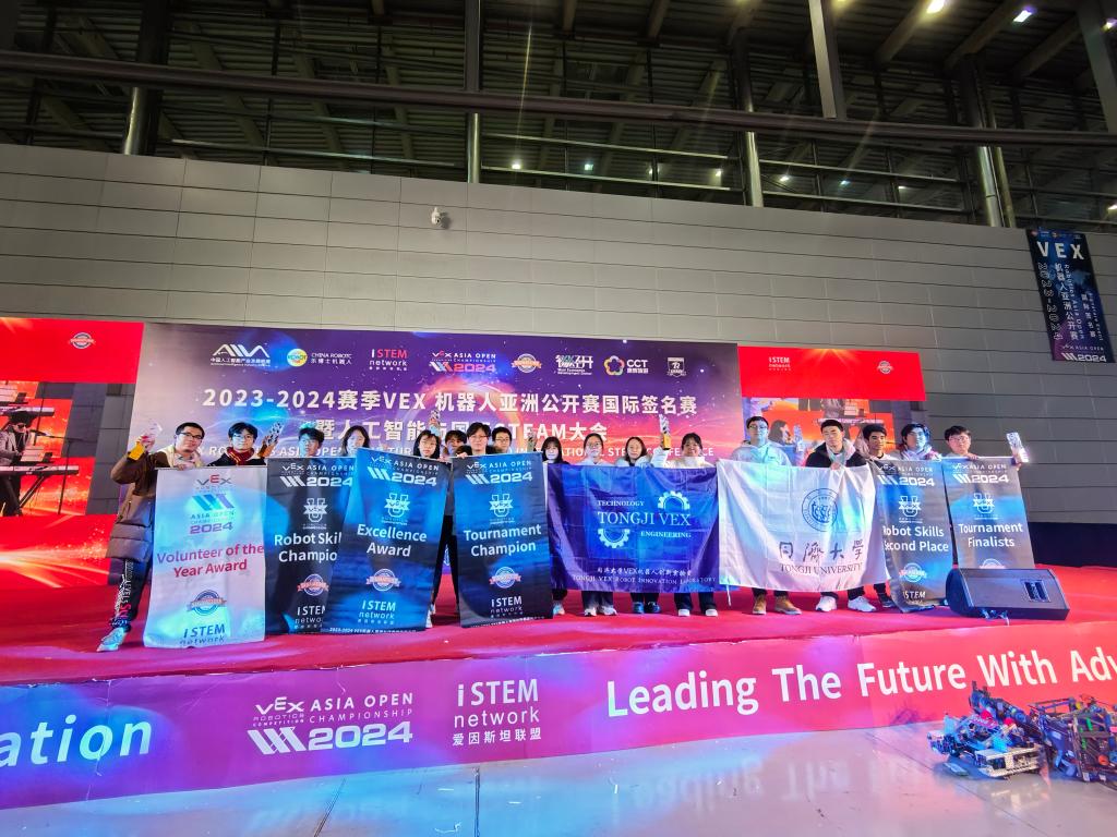2023年12月29日至2024年1月1日,VEX团队成员克服期末压力,参加了在无锡太湖国际博览中心举办的亚洲公开赛国际签名赛。该赛事吸引了近千只VEX机器人队伍、4000余名青少年参加。大学组VEX U组别吸引国内及港澳队伍7支参赛,包括香港大学联队、澳门大学联队、华南农业大学、上海理工大学等队伍参赛,经过3天近40场激烈角逐,TJU队获得全能奖(最高奖项),TJU2和TJU分获联赛冠亚军以及技能赛冠、亚军。队员们在赛场展现了优良的竞赛作风,本着友谊第一、比赛第二的理念与其他参赛队建立了良好的关系。比赛期间,参赛队员认真准备课程作业的场景也展现了努力勤奋的良好学风。之外,大家还积极参与比赛组织工作和志愿活动,获得赛事方颁发的最佳志愿者奖旗和奖杯。赛事方乐博士机器人有限公司给予队员们高度评价,并提供了餐饮与住宿后勤便利。