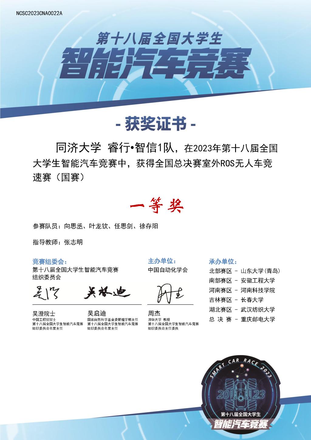 本次大赛也是全国大学生智能车竞赛实验室的2023年度收官比赛,为此,竞赛实验室负责人张志明老师在新学期招新工作结束后,便与参与辅助管理的杨思远、刘梦晓、许一航等老队员共同制定室外赛参赛计划,并选拔组建新一届队伍参加ROS无人车竞速赛。向思丞(人工智能)、叶龙钦(人工智能)、任思剑(人工智能)、徐存阳(自动化)四位同学组成“睿行·智信1队”,李静芝(通信工程)、李姝仪(微电子科学与工程)、张彤(自动化)、张冬雪(通信工程)四位同学组成“睿行·智信2队”。本次大赛分区赛采用线上比赛方式,总决赛则恢复为线下现场比赛方式。在本科生院、电信学院和嘉定校区管委办等单位的支持下,两支队伍积极备赛,团结协作,克服准备时间短和技术基础弱的困难,继双双获得南部赛区二等奖并获得国赛资格后,再接再厉,由张志明和朱劲两位老师带队,在重庆邮电大学太极体育场举办的全国总决赛中,努力应对比赛现场中的各类复杂因素并成功完赛,最终“睿行·智信1队”获得一等奖1项,“睿行·智信2队”获得三等奖1项。