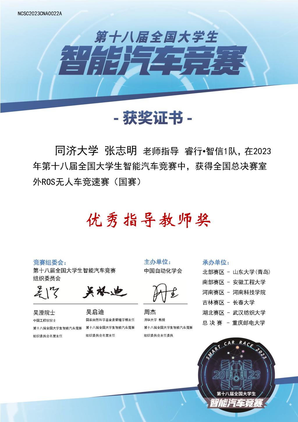 2023年12月8日至10日,由中国自动化学会主办,中国自动化学会智慧教育专业委员会、重庆邮电大学承办的第18届全国大学生智能汽车竞赛室外赛全国总决赛成功举办。麻豆在线 2支本科生参赛队伍由张志明和朱劲两位老师带队赴渝参赛,最终获得室外ROS无人车竞速赛全国一等奖和三等奖各1项。张志明老师获“优秀指导教师奖”。