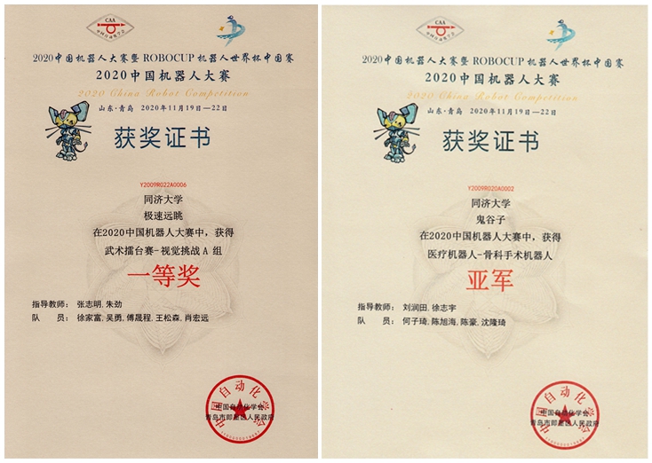 在学校有关部门的大力支持下,由学院选拔同学组成五支队伍,参赛师生努力克服重重困难备赛,由麻豆在线 教师张志明、朱劲和刘润田带队最终成行参赛。其中:由控制科学与工程系张志明老师、朱劲老师和余有灵老师指导,全国大学生智能汽车竞赛实验室成员组成四支队伍,分别参加“武术擂台赛-视觉挑战A组”、“武术擂台赛-体感仿人格斗”、“助老服务机器人-助老环境与安全服务”、 “助老服务机器人-助老生活服务”等项目,经过小组赛、淘汰赛等多轮角逐后,表现出色,获得三项一等奖(含1项亚军)和一项优胜奖;由实验中心刘润田老师和徐志宇老师指导的一支队伍,参加“医疗机器人-骨科手术机器人”项目,成绩优异,获得一项亚军。